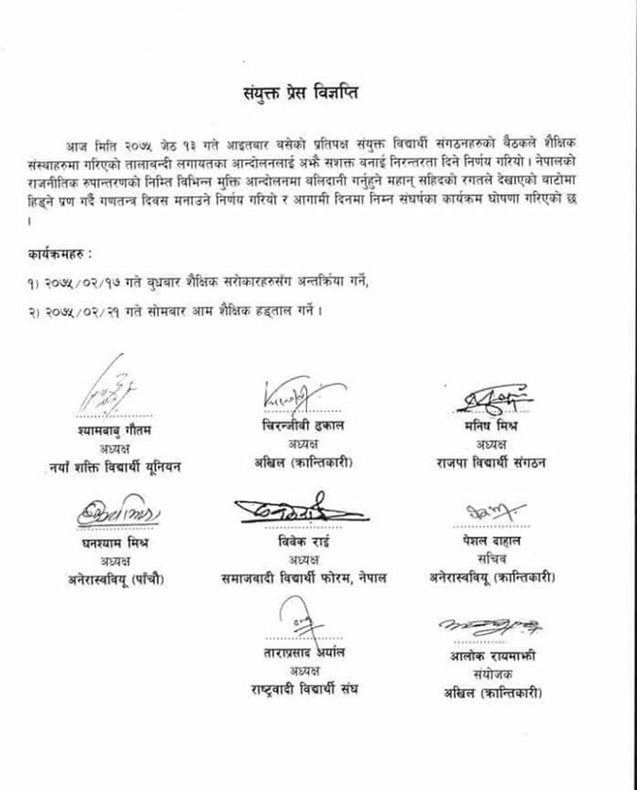 विभिन्न तीन विप्लव, बैध र बाबुराम भट्टराई नेतृत्वको पार्टीका भातृ विद्यार्थी संगठनहरुले आब्हान गरेको शैक्षिक हड्तालका कारण पठनपाठन प्रभावित बनेको छ । पेट्रोलियम पदार्थ मुल्यबृद्धी फिर्ता लिनुपर्ने लगायतका माग राखी शैक्षिक संस्था बन्दको आह्वान गरेका छन् ।