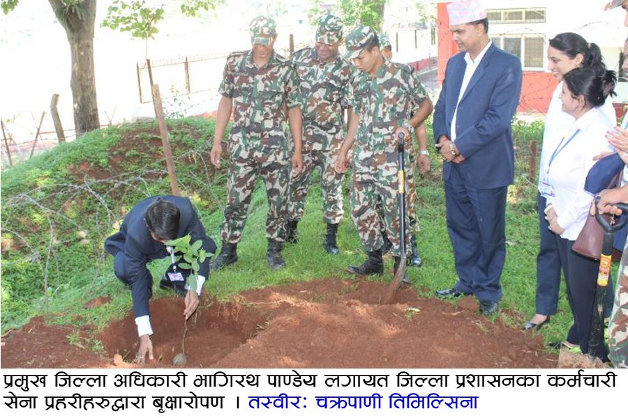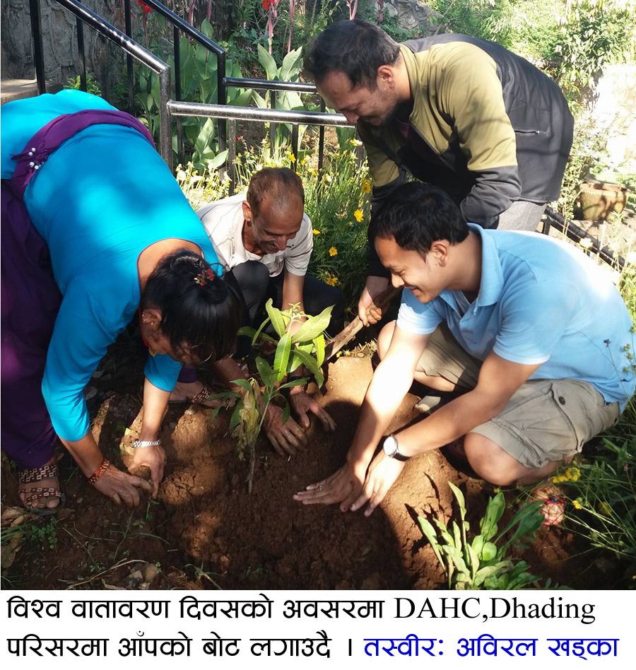 विश्व वातावरण दिवस २०१८ को अवसरमा धादिङ जिल्लाका प्रमुख जिल्ला अधिकारी भागिरथ पाण्डेयले देवीदत्त गण सुरक्षा गुल्म धादिङबेसी र जिल्ला प्रशासन कार्यालय धादिङको परिसरमा विरुवा रोपेर दिवस मनाएका छन् ।