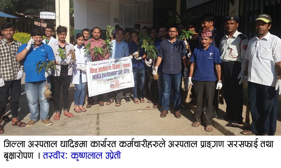 यस्तै जिल्ला अस्पताल धादिङमा कार्यरत कर्मचारीहरुले अस्पताल प्राङ्गण सरसफाई तथा बृक्षारोपण गरि विश्व वातावरण दिवस २०१८ मनाए ।