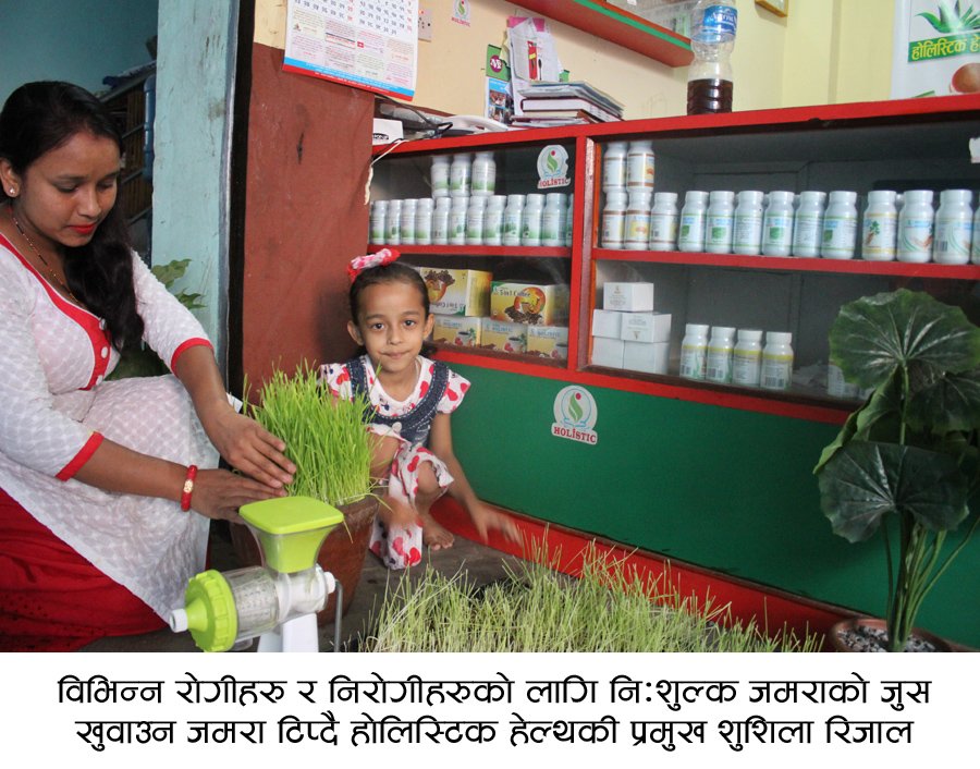 विश्व वातावरण दिवस २०१८ को अवसरमा धादिङबेसी स्थित होलिस्टक हेल्थ धादिङले निशुल्क जमराको जुस खुवाएको थियो । मानव स्वस्थ्य, दुषित वातवरण र प्रकृति प्रेमी मानव शरीरका लागी जमराको जुस अत्यत्न लाभदायीक भएकोले आज जनचेतनाको लागी जमराको जुस खुवाउँदै रोगी वा निरोगी सबैलाई जमराको जुस खान सिकाएको धादिङबेसी फिल्महल अगाडी अफिस रहेको होलिस्टिक हेल्थ धादिङर्की प्रमुख सुशिला रिजालले बताईन् ।