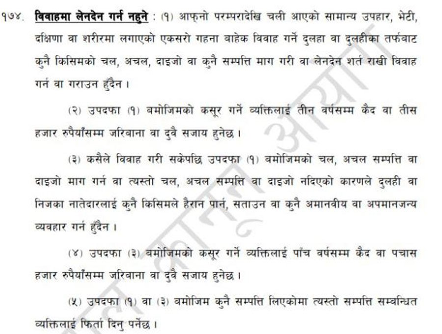 भदौ १ गतेदेखि लागू हुने मुलुकी अपराध ९संहिता० ऐन २०७४ लागू भएपछि भने दाइजो माग्ने र दाइजोका कारण महिला हिंसा गर्नेलाई कडा कारबाही हुने भएको छ ।