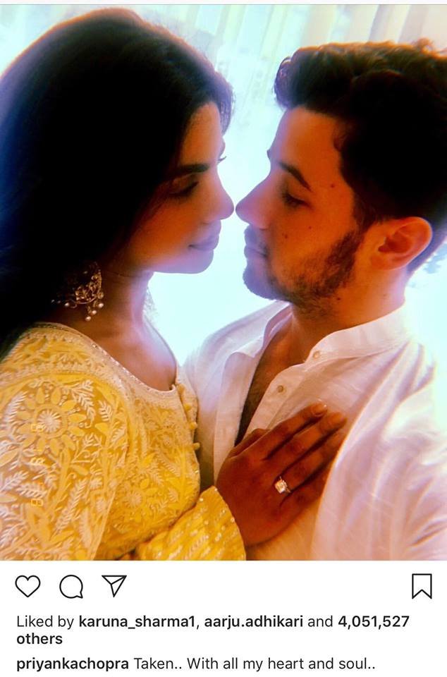 आफ्नो इन्गेजमेन्टको घोषणा गर्दै निकले प्रियंकासँगको एक रोमान्टिक फोटो पोष्ट गर्दै इन्स्टाग्राममा लेखे, ‘भावी मिसेज जोनस‘ मेरो मुटु।। मेरो प्रेम’ । यस्तै प्रियंकाले पनि त्यही फोटो सेयर गर्दै लेखिन्, ‘स्विकार‘ मेरो मन र आत्मासहित ।