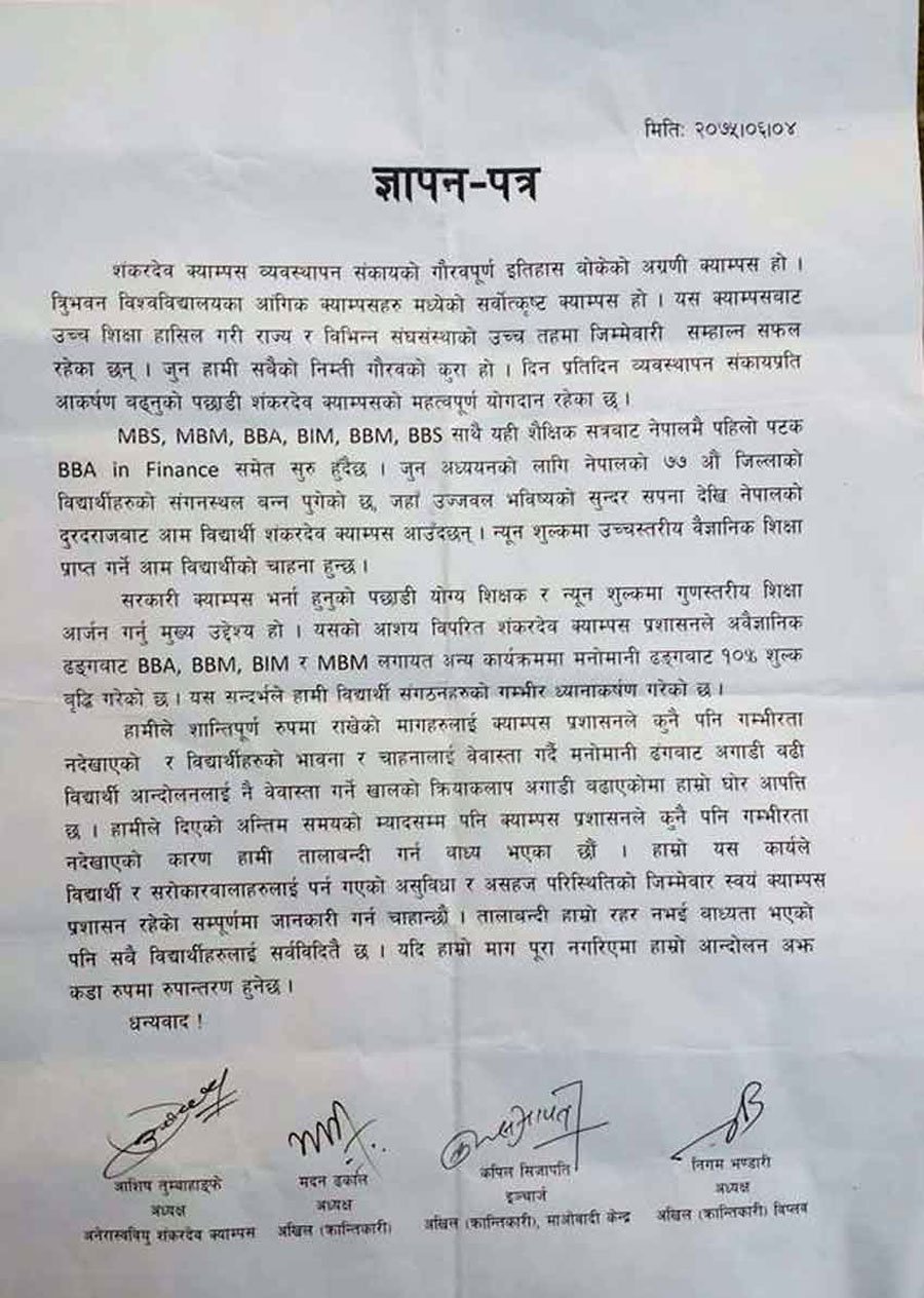 संगठनले क्याम्पस प्रसाशनले विधार्थीहरुको हकबिपरित विद्यार्थीले पढ्न नसक्ने गरि शुल्क वृद्धि गरेको आरोप लगाउँदै ज्ञापन पत्र बझाउँदै क्याम्पसमा तालाबन्दी गरेको हो ।