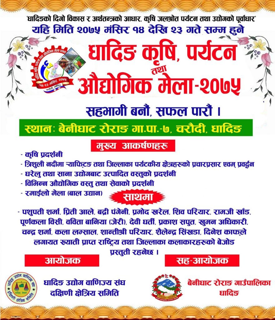 “धादिङको दिगो विकास र अर्थतन्त्रको आधार, कृषि पर्यटन जलश्रोत तथा उद्योगको पुर्वाधार” भन्ने मुल नाराका मंसिर १४ गते देखि २३ गते सम्म धादिङको चरौंदीमा हुन गहिरहेको महोत्सव उद्घाटन गर्न प्रचण्ड आउने पक्का भएको धादिङ उद्योग वाणिज्य संघका अध्यक्ष बोदनाथ दुवाडीले बताएका हुन् ।