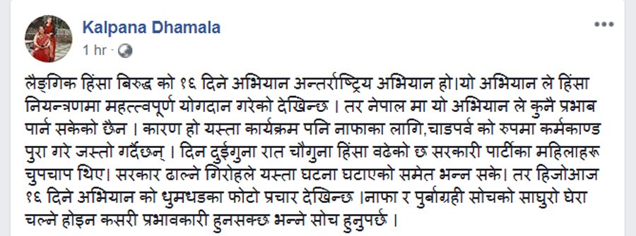 पुर्व मन्त्री धमलाले लैङ्गिक हिंसा बिरुद्धको दिवसको अवसरमा आफ्नो सामाजिक संजालमा पोष्ट गर्दै भन्छिन्, हिजोआज १६ दिने अभियानको धुमधडका फोटो प्रचार देखिन्छ । नाफा र पुर्बाग्रही सोचको साघुरो घेरा चल्ने होइन कसरी प्रभावकारी हुनसक्छ भन्ने सोच हुनुपर्छ ।
