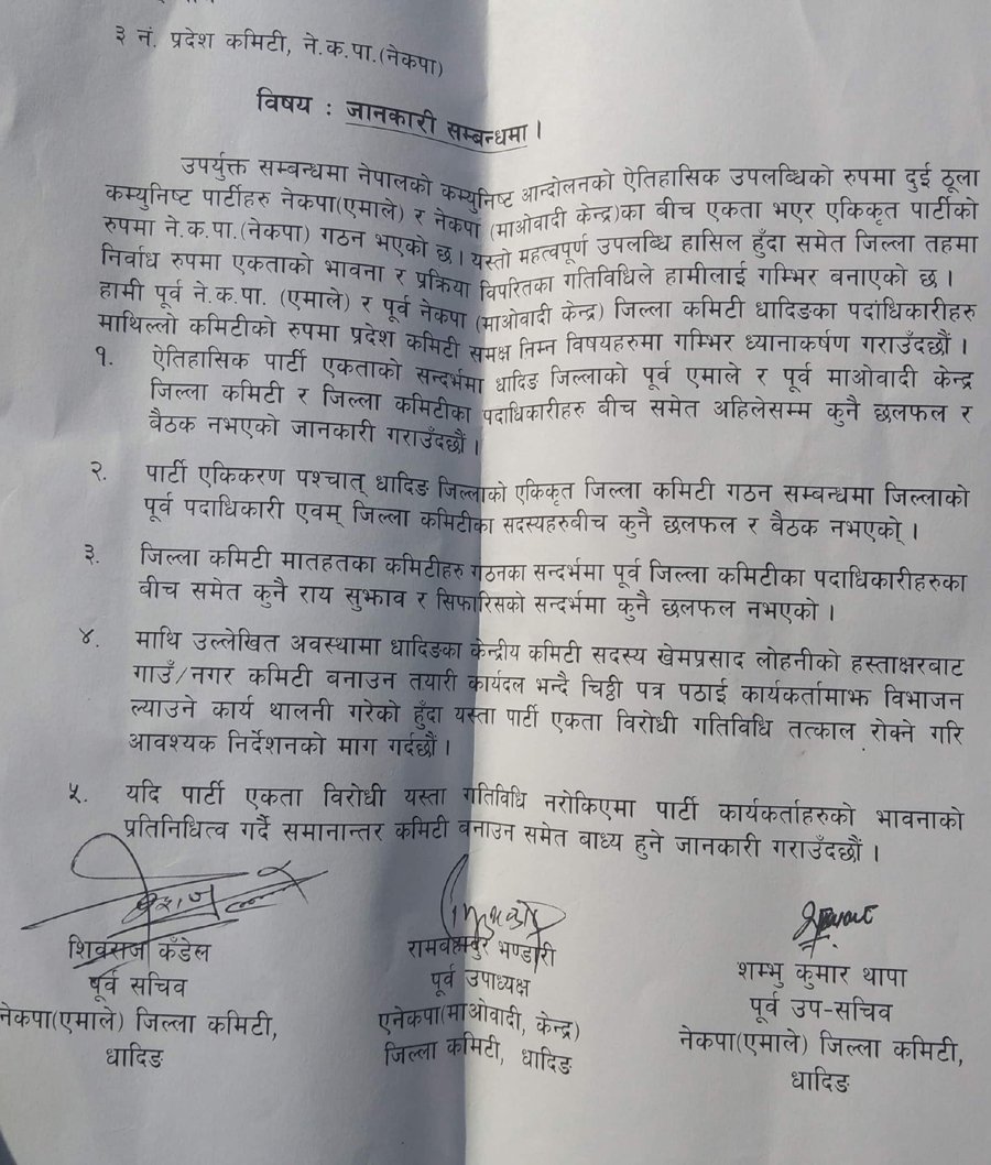संयुक्त हस्ताक्षरहेकाे पत्रमा कार्यकर्ता माझ विभाजन ल्याउन विभिन्न समितिहरुमा जवरजस्ती पत्र थमाईएको आरोप लगाउदै समानान्तर समिति निर्माण गर्ने सम्मको चेतावानीले नेपाल कम्युनिष्ट पार्टी (नेकपा) धादिङमा एकता भन्दा पहिले नै फुट्ने त हैन भन्ने त्रास कार्यकर्ता माझ देखिएको छ ।