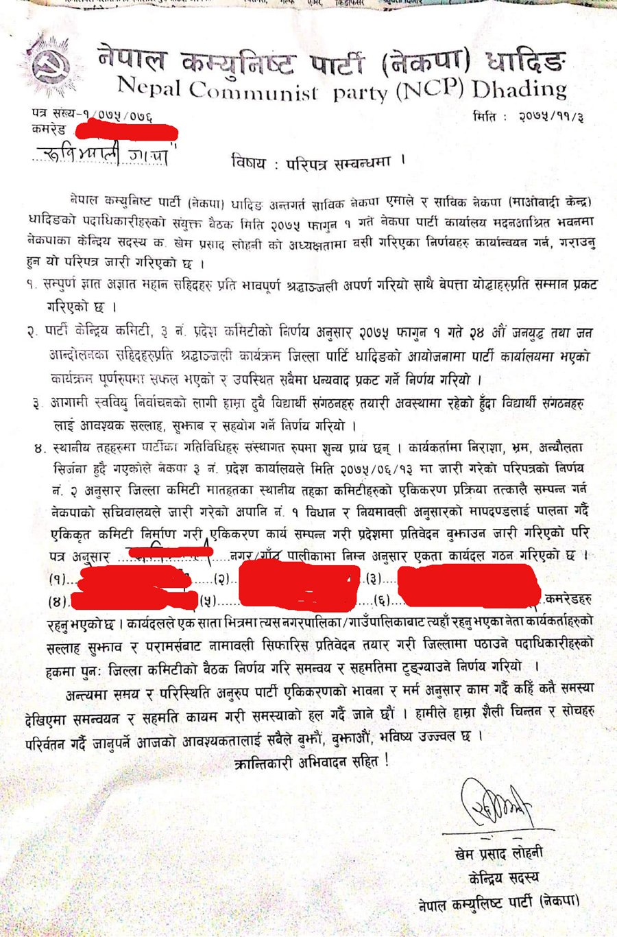 नेकपा (एमाले) का पुर्व जिल्ला सचिव शिवराज कँडेल, नेकपा (माओवादी केन्द्र) का पुर्व जिल्ला उपाध्यक्ष रामबहादुर भण्डारी र नेकपा (एमाले) का पुर्व जिल्ला उप सचिव शम्भु कुमार थापाको संयुक्त हस्ताक्षर रहेको ध्यानाकर्षण पत्र प्रदेश नं ३ का ईन्चार्जलाई भेटेर बुझाउँदै केन्द्रिय सदस्य खेम प्रसाद लोहनीले गाउँ तथा नगरपालिकामा गरेको परिपत्र एकलौटी ढंगले निर्णय गरेको र साे हर्कत पार्टी एकता विरोधी भएकाे साेही अनुसारकाे गतिविधी भइरहेकाे बताए ।