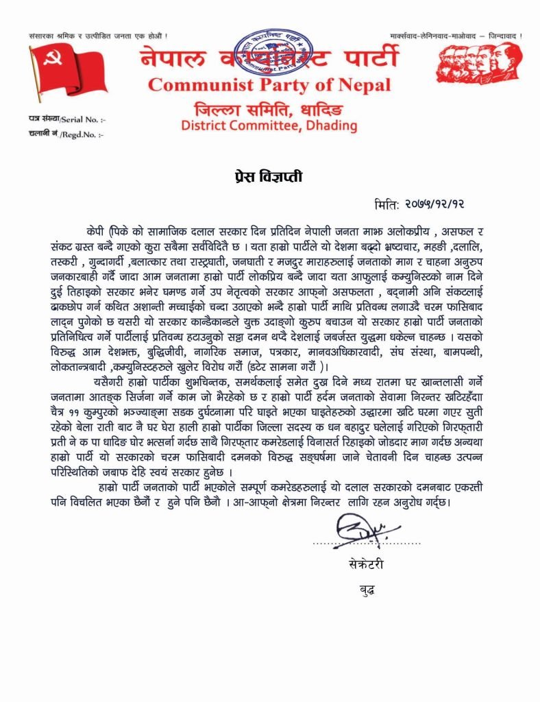 चैत्र ११ गते कुम्पुरमा ढुङ्गा बाेकेकाे गाडी दुर्घटनामा घाईतेलाई उद्दार गरि घर पुगेका नेकपा धादिङका कार्यकर्ता धनबहादुर घलेलाई पक्राउ गरेपछि जिल्ला सेक्रेटरी बुद्धले विज्ञप्ति जारी गर्दै भत्सर्ना गरेका हुन् ।