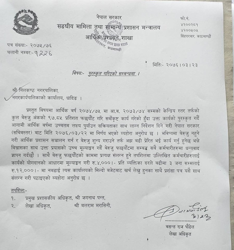 संघीय मामिला तथा सामान्य प्रशासन मन्त्रालय आर्थिक प्रशासन शाखाले नीलकण्ठ नगरपालिकालाई पत्र नै पठाएर बेरुजु फछ्र्यौटमा सहभागि हुने तात्कालिन प्रमुख प्रशासकीय अधिकृत जगननाथ पन्त र लेखा अधिकृत बलराम मरासिनीलाई पुरस्कृत गर्न निर्देशन गरेको छ ।
