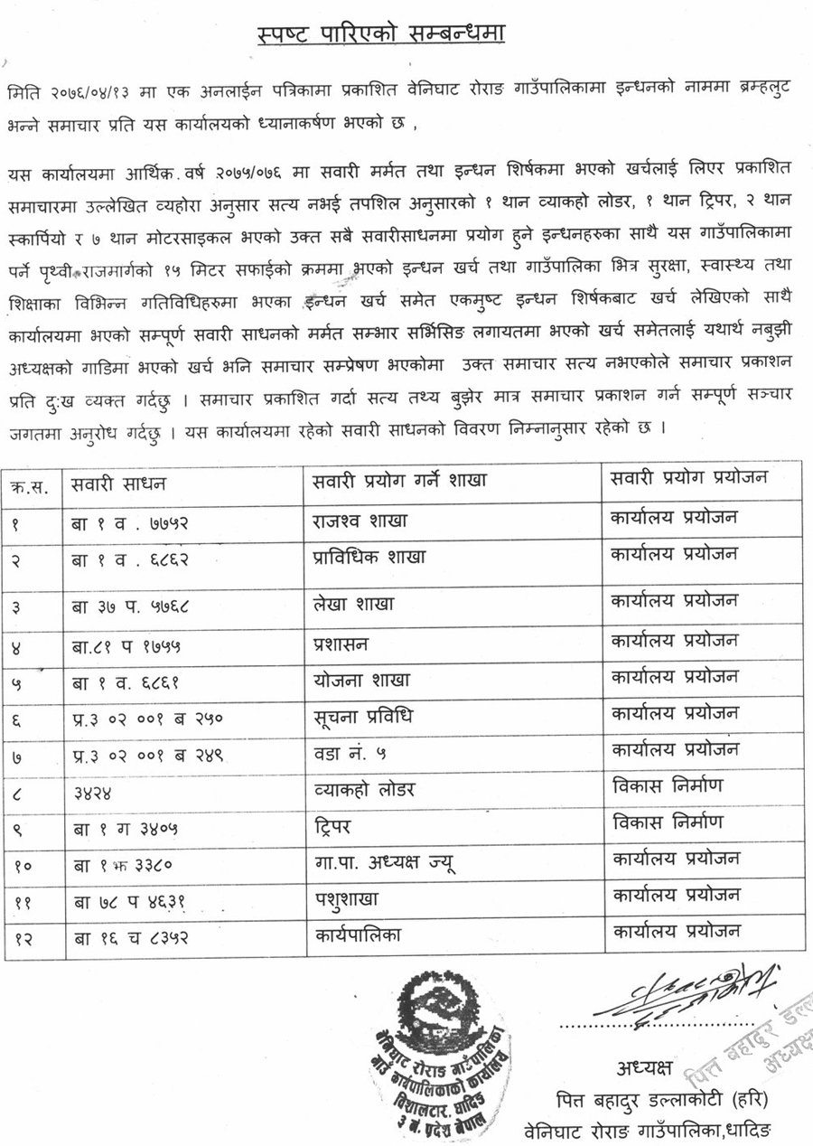 १ थान ब्यकहो लोडर, १ थान ट्रीपर, २ थान स्कार्पियो र ७ थान मोटरसाइकल भएको र उक्त सवै सवारीसाधन हरुमा प्रयोग हुने इन्धन हरुको साथै यस गाउँपालिका मा पर्ने पृथ्वीराजमार्ग को १५ मिटर सफाइको क्रम मा भएको इन्धन खर्च तथा गाउँपालिका भित्र सुरक्षा, स्वास्थ्य तथा शिक्षा का विभिन्न गतिबिधी हरुमा भएका इन्धन खर्च समेत एकमुष्ट इन्धन शिर्षकबाट खर्च लेखिएको साथै कार्यलयमा भएको सम्पुर्ण सवारीसाधनको मर्मत संहार, सर्भिसिङ लगाएतमा भएको खर्चलाई समेत यथार्थ नबुझी अध्यक्षको ब्रम्हलुट भनिएको बताएका छन् ।