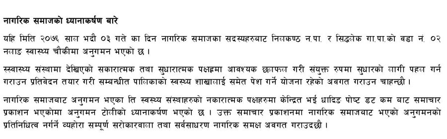 उक्त समाचारबारे नागरिक समाजले ध्यानाकर्षण भएको जनाउँदै sherbb8@gmail.com बाट इमेल गरेको छ ।