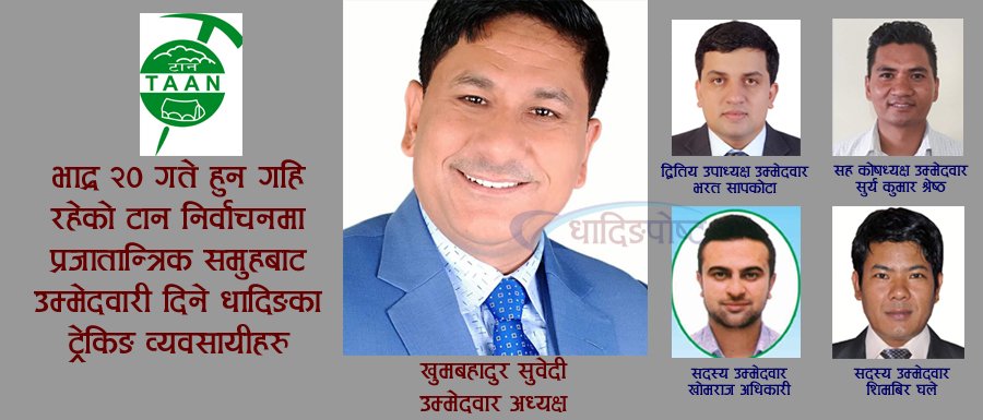 प्रजातान्त्रिक समुहबाट (टान) निर्वाचनमा अध्यक्ष उम्मेदवार खुमबहादुर सुवेदी ज्वालामुखी गाउँपालिका ६ हुन् । यस्तै द्वितिय उपाध्यक्षमा भरत सापकोटा नेत्रावती डब्जोङ गाउँपालिका ५ का हुन् । अर्का सह–कोषाध्यक्षमा सूर्यकुमार श्रेष्ठ नीलकण्ठ नगरपालिका १३ का हुन् । यसैगरी टान निर्वाचनको लागी धादिङका खोमराज अधिकारी र शिमबिर घलेले सदस्य पदका लागि उम्मेदवारी दिने भएका छन् ।