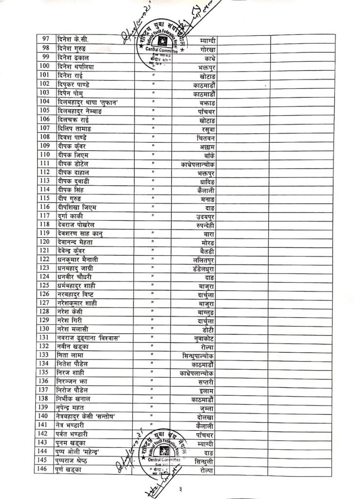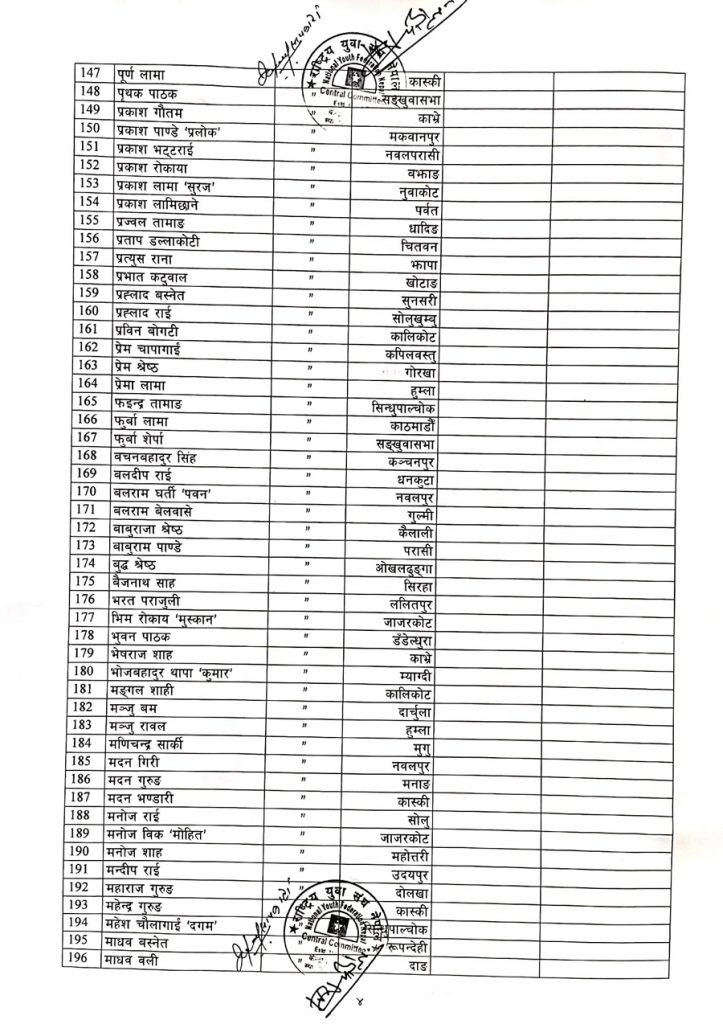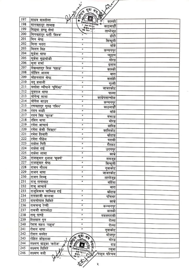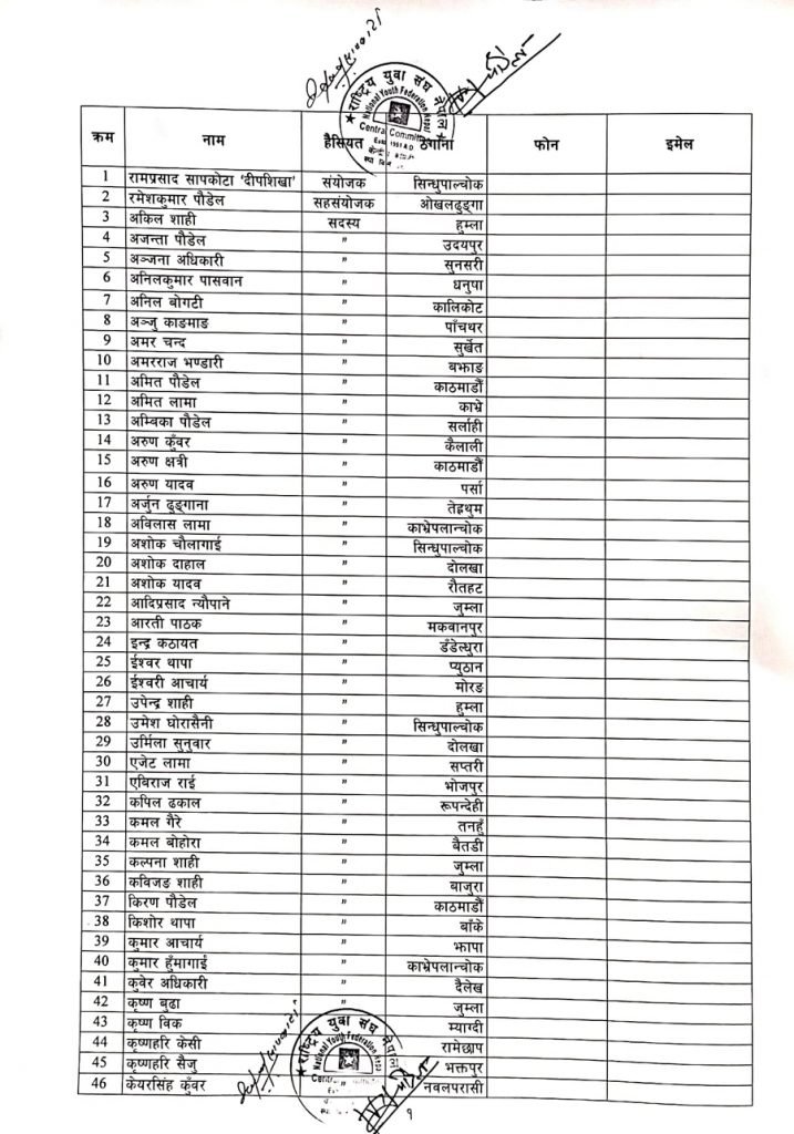 राष्ट्रिय युवा संघ नेपालको केन्द्रीय समितिको नामावली