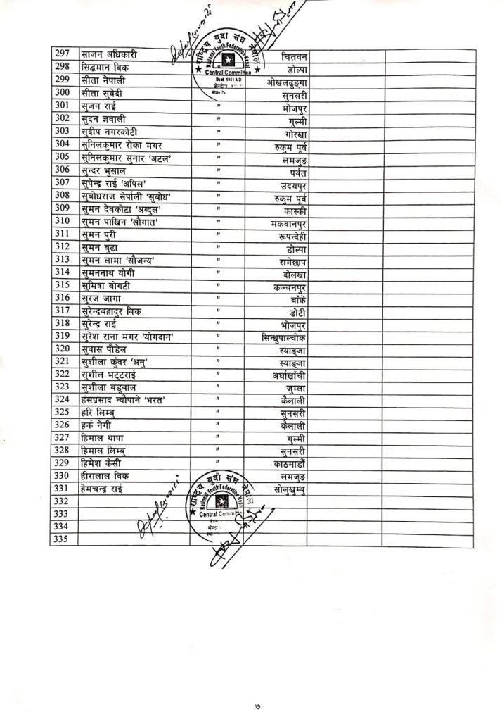युवा संघ नेपालका अध्यक्ष रामप्रसाद सापकोटाले सार्वजनिक गरेका ३ सय ३१ जना केन्द्रिय समितिको नाम लिस्टमा धादिङबाट पूर्व एमाले निकट युवा संघबाट ७ जना र पूर्व माओवादी केन्द्रको वाईसिएलबाट १ जना गरि ८ जनाको नाम परेको हो।