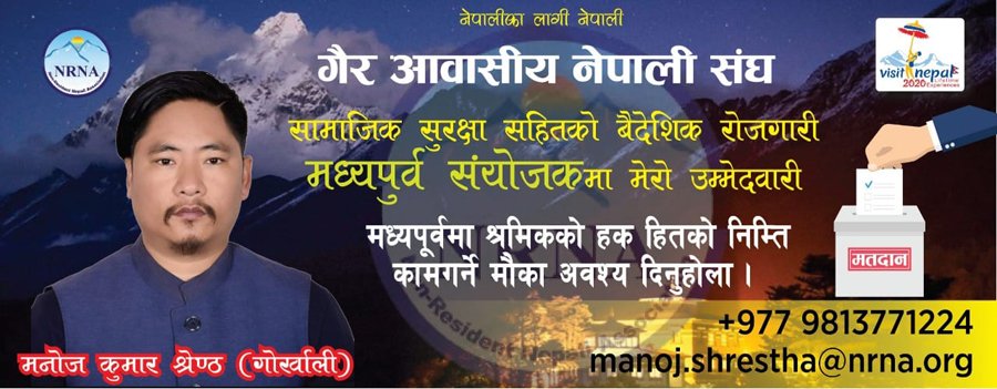 यस्तै सामाजिक सुरक्षा सहितको वैदेशिक रोजगारी नारा बोकेर मनोजकुमार श्रेष्ठ (गोर्खाली) ले मध्यपूर्वको संयोजक पदको लागि उम्मेदवारी घोषणा गरि चुनावी मैदानमा देखिएका छन् । मध्यपूर्वी देशहरूमा इजिप्ट, इराक, जोर्डन, कुवेत, लेबनान, ओमन, बहराइन कतार, साउदी अरेबिया र युएई पर्दछन् ।