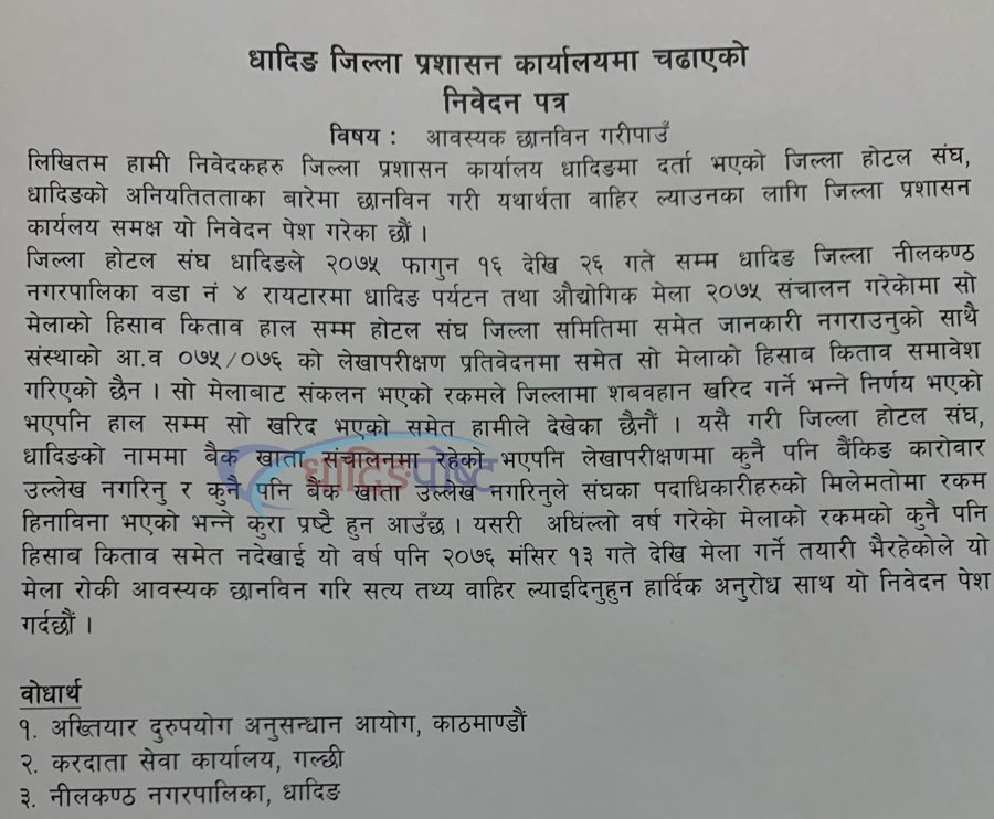 धादिङ कार्तिक १९ । धादिङबेसीमा मंसिर १३ गते देखि धादिङ पर्यटन महोत्सव तथा व्यापार मेला नाम दिएर कार्यक्रमको तयारीमा जुटेको जिल्ला होटल संघ धादिङ विरुद्ध जिल्ला प्रशासन कार्यालय धादिङमा उजुरी परेको छ ।
