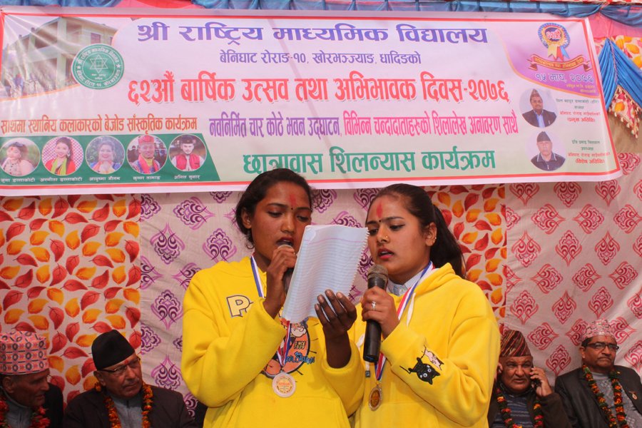 कार्यक्रममा विद्यालयका प्रधानाध्याप दिपक रिजालले विद्यालयको प्रतिवेदन सार्वजनिक गर्दै १२ कक्षा संचालन भएको यस विद्यालयमा मावि दरवन्दी एउटा पनि नभएको निमावि तहको पनि २ जना राहत अरु ६ जना प्रा.वि. दरबन्दीका शिक्षक “बाँकी सबै निजीस्रोतका शिक्षक रहेको बताए ।”
