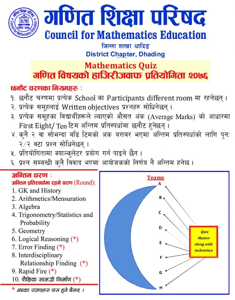 कक्षा ९ र १० मा अध्ययनरत विद्यार्थीहरुले भाग लिन पाउने उक्त प्रतियोगिता फागुन १७ गते शनिबार धादिङबेसी स्थित नीलकण्ठ माध्यामिक विद्यालय प्राङ्गणमा हुने भएको हो ।