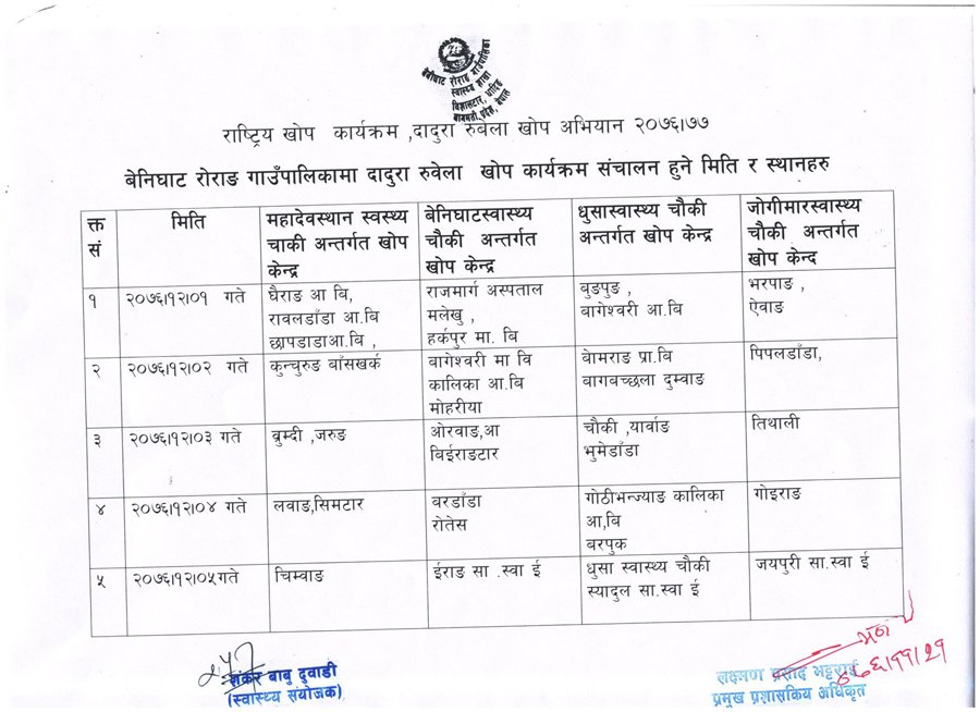बेनिघाट रोराङ गाउँपालिकाले वडा नम्बर १ देखि १० सम्मका सबै वस्तीका बालबालिकालाई चैत्र १ देखि ९ गतेसम्म दादुरा रुबेला खोप लगाउने कार्ययोजना तयार भएको छ ।