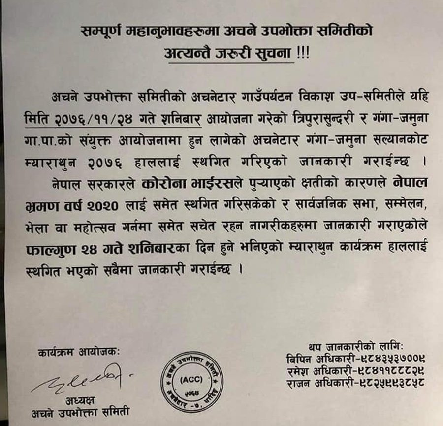 आयोजक अचने उपभोक्ता समितिले सूचना जारी गर्दै सरकारले सभा सम्मेलन भेला वा महोत्सव जस्ता कार्य नगर्न र कोरोना भाईसरको संक्रमणबाट जोगिन आग्रह गरिएकोले प्रतियोगिता स्थगित गरिएको जनाएको छ ।