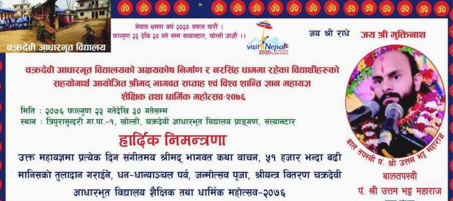 चक्रदेवि आधारभुत विद्यालयको अक्षयकोष निमार्ण र नरसिंह धाममा रहेका विद्यार्थीको सहयोगार्थ हुने भनिएको उक्त श्रीमद भागवत सप्ताहको कथा वाचन बालतपस्वी पण्डित उत्तम भट्ट महाराजले गर्ने कार्यक्रम रहेको थियो ।