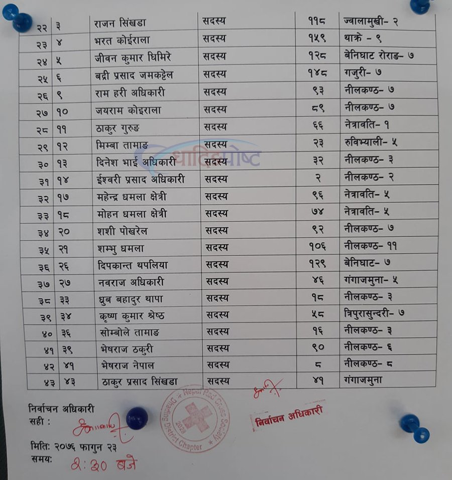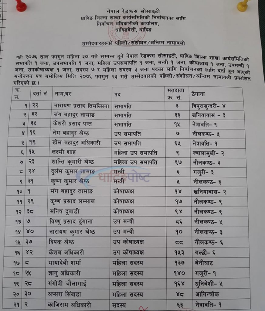 धादिङ फागुन २३ । नेपाल रेडक्रस सोसाईटी जिल्ला शाखाको फागुन ३० गते हुने निर्वाचनको लागि उम्मेदवारी मनोनयन दर्ता सकिएको छ ।