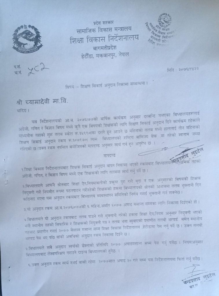 माध्यामिक तहको तलव स्केल अनुसार तीन महिनाको तलव एकमुष्ट १ लाख ७ हजार ९९० रुपैया ४५ अनुदान पाउने ४५ वटै विद्यालयको खातामा पठाई सकिएको सामाजिक विकास मन्त्रालयले जनाएको छ ।