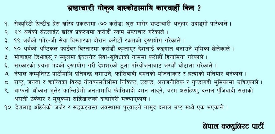 घटना स्थलमा ‘भ्रष्टाचारी गोकुल बास्कोटामाथि कारबाही किन ?’ भन्ने शीर्षकमा नेकपाको पर्चा भेटिएको सँगै उसैले बम विष्फोट गराएको हुन सक्ने प्रहरीले जनाएको छ ।