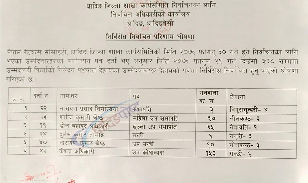 धादिङ फागुन २९ । नेपाल रेडक्रस सोसाईटी जिल्ला शाखाको फागुन ३० गते (शुक्रबार) हुने निर्वाचन पूर्व नै सभापति सहित छ जना उम्मेदवार निर्विरोध निर्वाचित भएका छन् ।