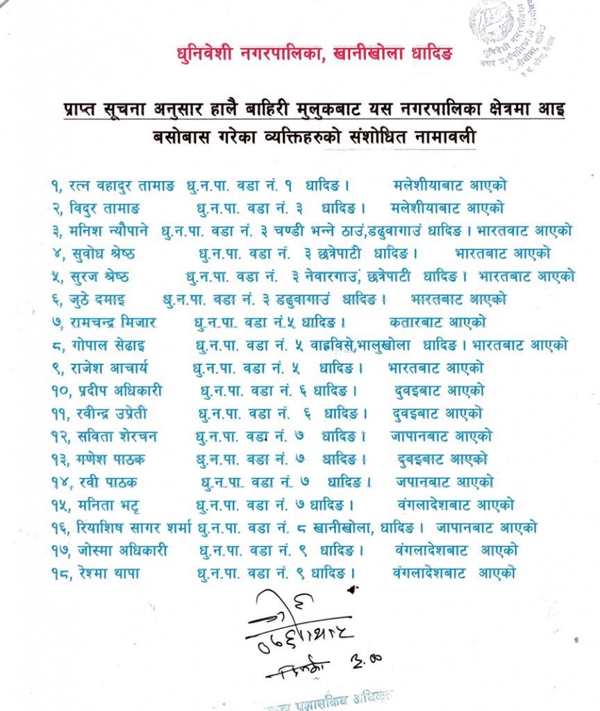 धुनिबेसी नगरपालीकाले विभिन्न देशबाट घर आएका १८ जनाको नामावली शनिबार सार्वजनिक गरेको हो ।