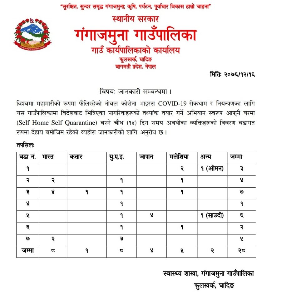 धादिङ चैत्र १७ । धादिङको गंगाजमुना गाउँपालिकाले पनि भारत लगायत विभिन्न मुलुकबाट चैत्र महिनामा घर आएका व्यक्तिहरुको संख्या सार्वजनिक गरेको छ ।