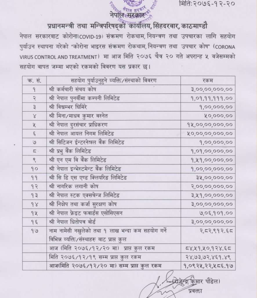 कोषमा बिहिबार मात्रै ८४ करोड करोड ५१ लाख ५० हजार १ सय २४ रुपैयाँ जम्मा भएको प्रधानमन्त्री कार्यालयका प्रवक्ता राजेन्द्र कुमार पौडेलले बताएका हुन् ।