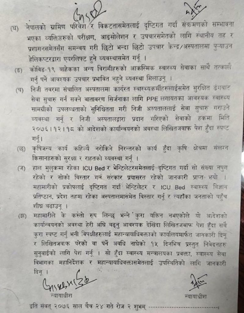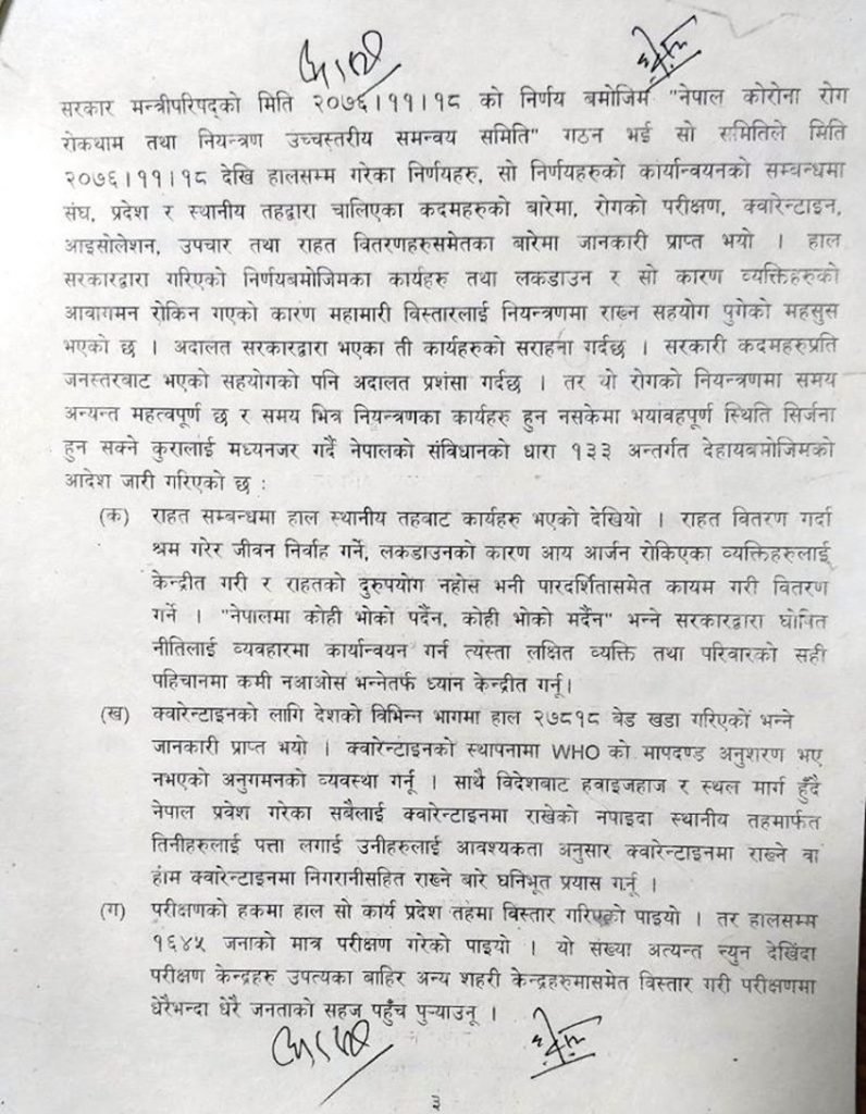 सर्वोच्च अदालतले कोरोना भाइरस नियन्त्रणका र राहात वितरणका लागि सरकारका नाममा ९ बुँदे आदेश जारी गरेको हो ।