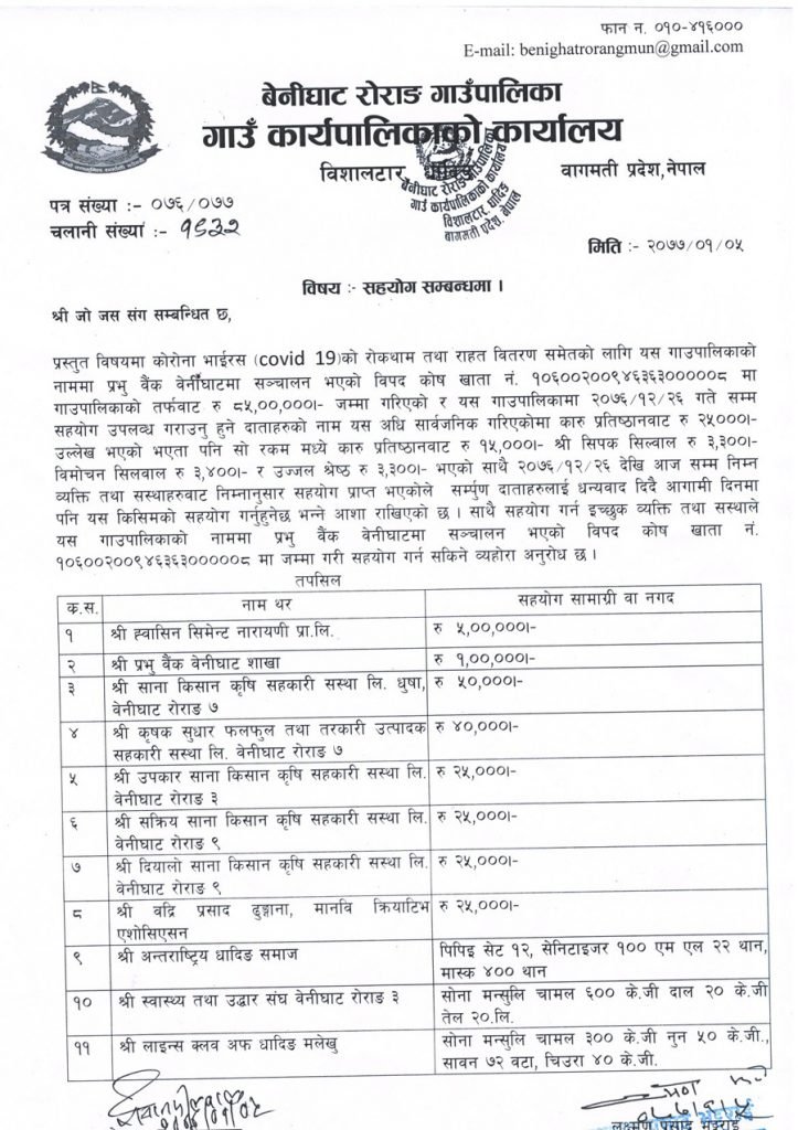 यस्तै बेनिघाटका स्थानिय क्लव, प्रतिष्ठान, व्यक्तिहरुले समेत सहयोग गरेको नामावली सार्वजनिक गर्दै गाउँपालिकाले आफुले सकेको सहयोग गाउँपालिकाको विपदकोषमा जम्म गरिदिन समेत अपिल गरेको छ ।