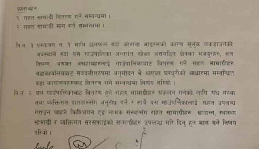 गाउँपालिका प्रमुख प्रेमनाथ सिलवालको अध्यक्षतामा सम्पन्न बैठमका राहात वितरणर र राहात सामाग्री माग गर्ने भन्ने दुई प्रस्ताव माथि छलफल हुँदा बैठकले क्रिश्चियन एड सँग सहयोग माग्ने निर्णय गरेको हो ।