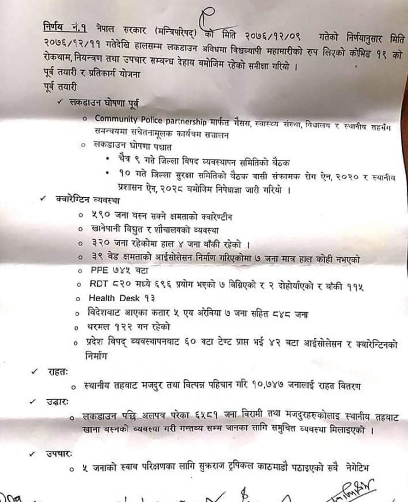 सरकारको मन्त्रिपरिषद वैठकले लकडाउन जेष्ठ ५ गते सम्म लब्याए सँगै सीएमसी धादिङको बैठकले जिल्ला प्रवेश गर्ने नाकाहरुमा थप कडाई गर्ने, पास बाहेका कुनै पनि सवारी साधनहरु चल्न नदिने लगाएतका निर्णयहरु गरेको हो ।