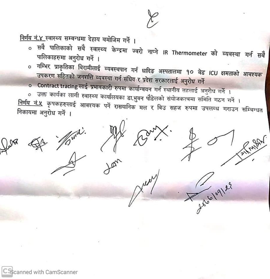धादिङ बैशाख २६ । धादिङको प्रमुख जिल्ला अधिकारी आसमान तामाङको संयोजकत्वमा रहेको सीएमसी धादिङले कोरोना भाईरस संक्रमणको रोकथाम तथा उपचारको अवस्था, लकडाउनको अवधीको समिक्षा लगायतका विषयमा विभिन्न निर्णयहरु गरेको छ ।