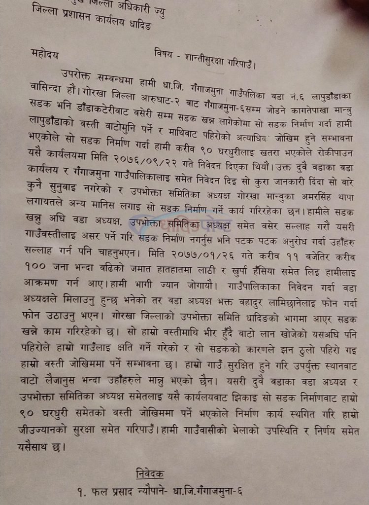गोरखा आरुघाट २ बाट गंगाजमुना ६ सम्म कागतेपाखा मान्बु सडक भनेर डाँडाकठेरीबाट बसेरी सम्म खन्न सुरुभए सँगै लापुडाँडाका ९० घरधुरी पहिरोको जोखिममा परेको भन्दै स्थानीयहरु प्रमुख जिल्ला अधिकारीको ध्यानाकर्षण गराउन आईतबार जिल्ला सदरमुकाम धादिङबेसी आएको हुन् ।