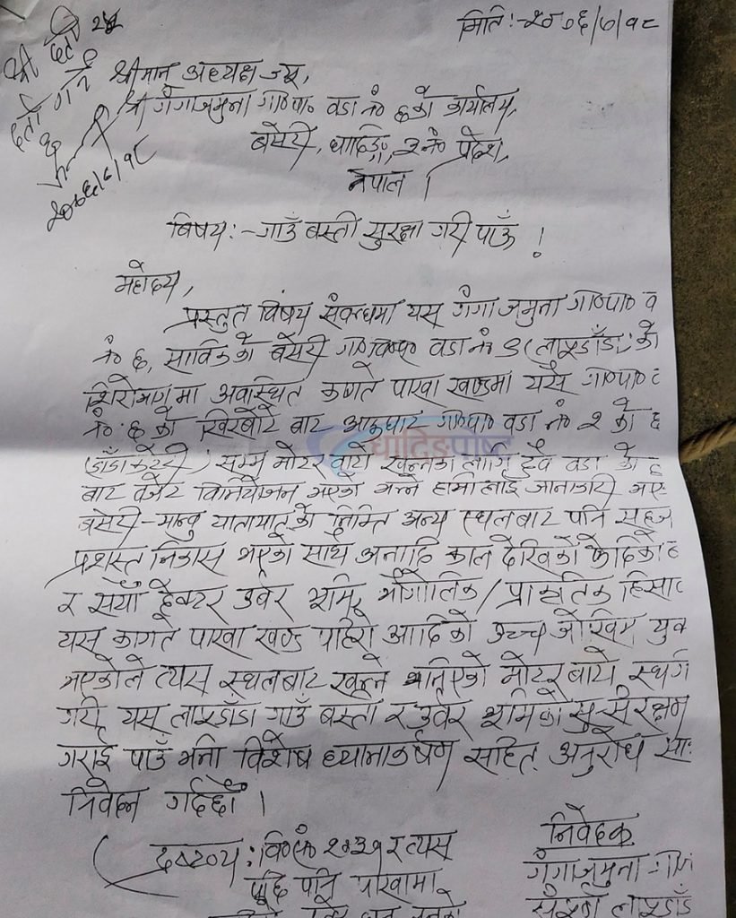 यस अघि पौष २२ गते पनि उनीहरुले उक्त स्थानबाट सडक नखन्न र खन्नै परेमा डोजर प्रयोग नगर्न जिल्ला प्रशासन, गाउँपालिका र वडामा निवेदन दिएका थिए तर कतैबाट सुनुवाई नभई सडक निमार्ण सुरु भए सँगै पुन: दास्रो ध्यानाकर्षण पत्र बोकेर जिल्ला प्रशासन आएका हुन् ।