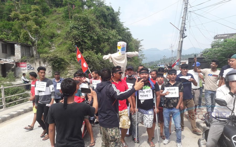 ‘कालापानी-लिपुलेक-लिम्पियाधुरा हाम्रो हो,’ ‘भारतीय दादागिरी बन्द गर,’ ‘हाम्रो भूमि फिर्ता गर’ जस्ता नारा अंकित प्लेकार्ड बोकेर समुहले मंगलबार चरौंदीमा विरोध प्रदर्शन गर्दै मोदीको पुत्ला दोहन गरेका हो ।