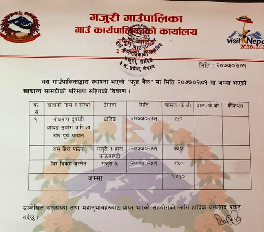 यस्तै गजुरीले विज्ञप्ती जारी गर्दै बिहिबार धादिङबेसीमा दुवाडी एग्रोभेट संचालन गरेर बसेका बोदनाथ दुवाडीले धादिङ उद्योग वाणिज्य संघ मार्फत २१० केजी चामल, गजुरीका राम हिरा पाठकले ७५० केजी चामल र गजुरी कै थिरविक्रम बस्नेतद्वारा ४५० केजी चामल फुड बैकमा जम्मा भएको जनाएको छ ।