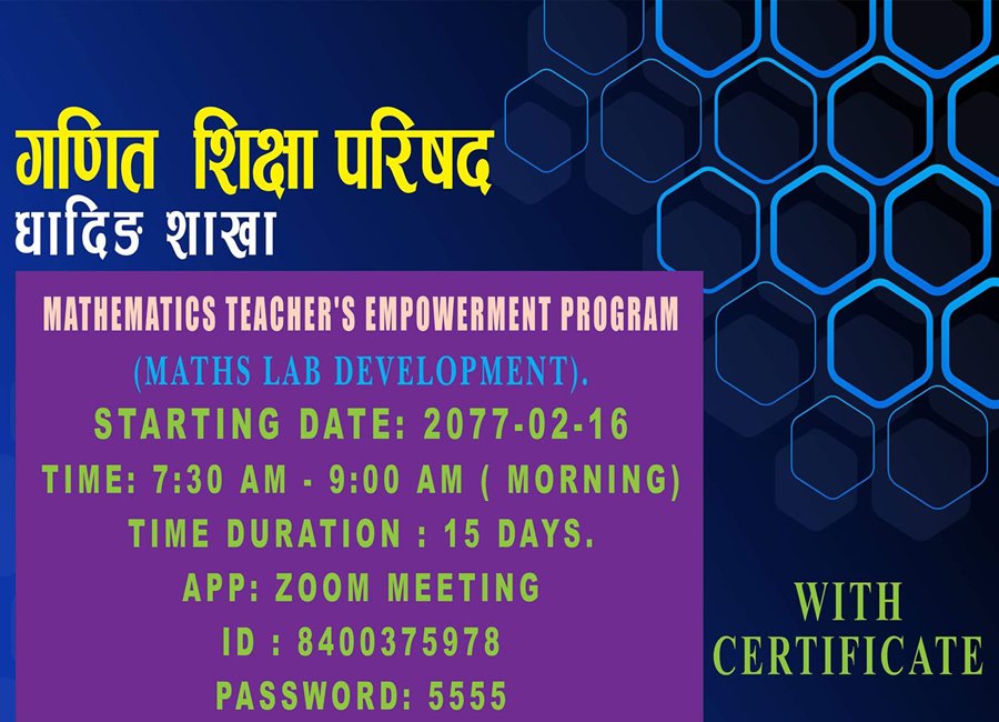 धादिङ जिल्लामा सरकारी तथा निजी विद्यालयमा अध्यापन गराउने गणित विषयका शिक्षकहरु आवद्ध गणित शिक्षा परिषद धादिङले लकडाउनका कारण अनलाईन भिडियोबाट आज देखि १५ दिन सम्म गणित प्रयोगशाल विकास सम्बन्धी अभिमुकिकरण कार्यक्रम गर्ने भएको हो ।
