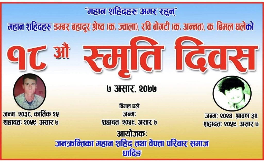आजको ठिक १८ वर्ष अगाडी आसर ७ गते धादिङ नीलकण्ठ स्थित खाल्टेका डम्बर बहादुर श्रेष्ठ (ज्वाला) नुवाकोटका रवि बोगटी (अनन्त) र बिमल घलेले सहादत प्राप्त गरेको दिन ।