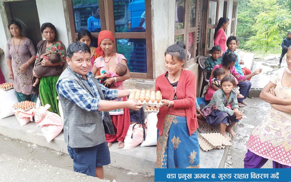 कुपोषित बालबालिकाको परिवारलाई प्रति परिवार ३० किलो चामल, साढे २ किलो सर्वोत्तम पिठो ३ किलो, खाने तेल २ लिटर, दाल २ किलो, एक क्रेट अण्डा, मिश्रित गेडागुडी २ किलोको साथै ५ वटा हातधुने सावुन, २ वटा लुगाधुने सावुन, मञ्जन १ र ब्रश ३ थान स्वच्छता सामाग्री वडा अध्यक्ष अम्बर बहादुर गुरुङले हस्तान्त्रण गरेका थिए ।