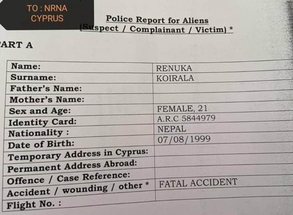 धादिङ साउन १२ । अध्ययनको सिलसिलामा साईप्रस रहेकी धार्के निवासी रेणुका कोईरालाको मोटरसाईकल दुर्घटनामा परी निधन भएको छ ।