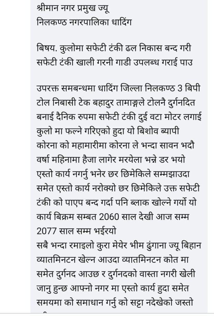 यस्तै गुरु दाहालले आफ्नो फेसबुकमा लेखेका लेख्नु हुन्छ, बिपी टोल, बीचबजार टोल, प्रसंसा टोलमा बस्नै न सक्नी गरि, यो कोरोनाको महामारी भन्दा हैजाको महामारी भयो यो बर्खाको समयमा, नीलकण्ठको फोहोर व्यवस्थापनको कार्यालय शम्भु सिंह ठकुरी घरमा छ, उक्त कार्यालयबाट दश मिटरमा यस्तो कार्य भएको छ ।
