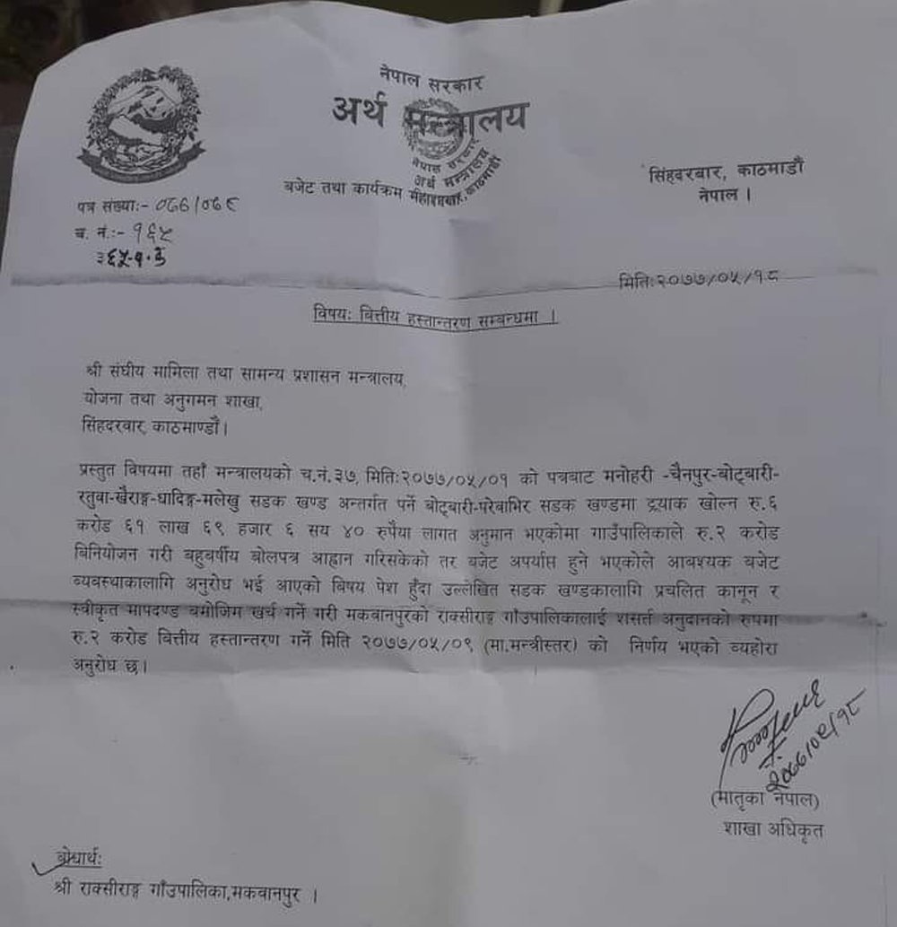 मन्त्रालयले आधिकारिक पत्र लेखेर मकवानपुरको राक्सिराङ गाउँपालिकामा रहेको परेवाभीरको लागि ससर्त अनुदानको रुपमा २ करोड रुपैयाँ विनियोजन उपलब्ध गराउने जानकारी दिएको हो ।