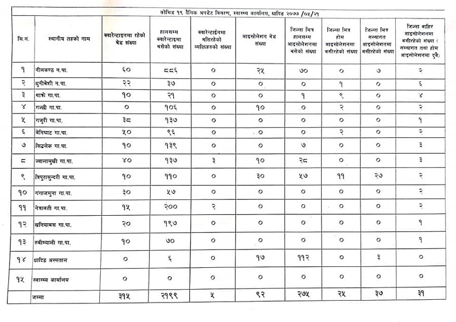 जसमा त्रिपुरासुन्दरी गाउँपालिकामा मात्र ११ जना, थाक्रे गाउँपालिकामा ९ जना, बेनीघाट रोराङमा २ जना, गल्छी गाउँपालिकामा २ जना र धुनीबेसी नगरपालिकामा १ जना हाईसोलेशनमा रहेका छन् ।
