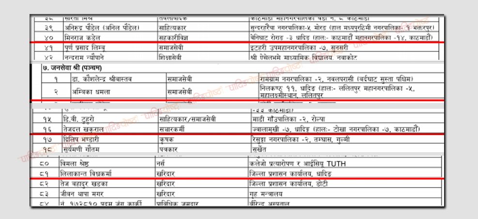 यसैगरी सरकारले धादिङ नीलकण्ठ नगरपालिका ११ (हाल ललितपुर बस्ने) अम्बिका धमला, ज्वालमुखी गाउँपालिका (हाल काठमाडौं बस्ने ) बस्ने संचारकर्मी तेजदत्त खकुराल र जिल्ला प्रशासन धादिङमा कार्यरत लिलाकान्त विश्वकर्मालाई जनसेवा श्री (पञ्चम) पदकबाट सम्मान गरेको छ ।
