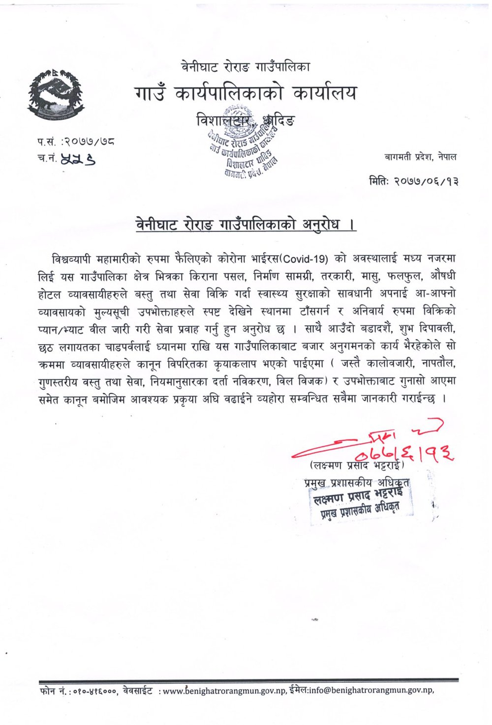 बेनीघाट रोराङ असोज १३ । विश्वव्यापी महामारीको रुपमा फैलिएको कोरोना भाईरस (कोभिड १९) को अवस्थालाई मध्य नजरमा लिई यस गाउँपालिका क्षेत्र भित्रका किराना पसल, निमार्ण सामाग्री, तरकारी तथा फलफुल, मासु, औषधी, होटल व्यवसायीहरुले बस्तु तथा सेवा विक्रि गर्दा स्वास्थ्य सुरक्षाको सावधानी अपनाई आ आफ्नो व्यवसायको मुल्य सूची उपभोक्ताहरुले स्पष्ट देखिने स्थानमा टाँस गर्न अनुरोध गरिन्छ ।